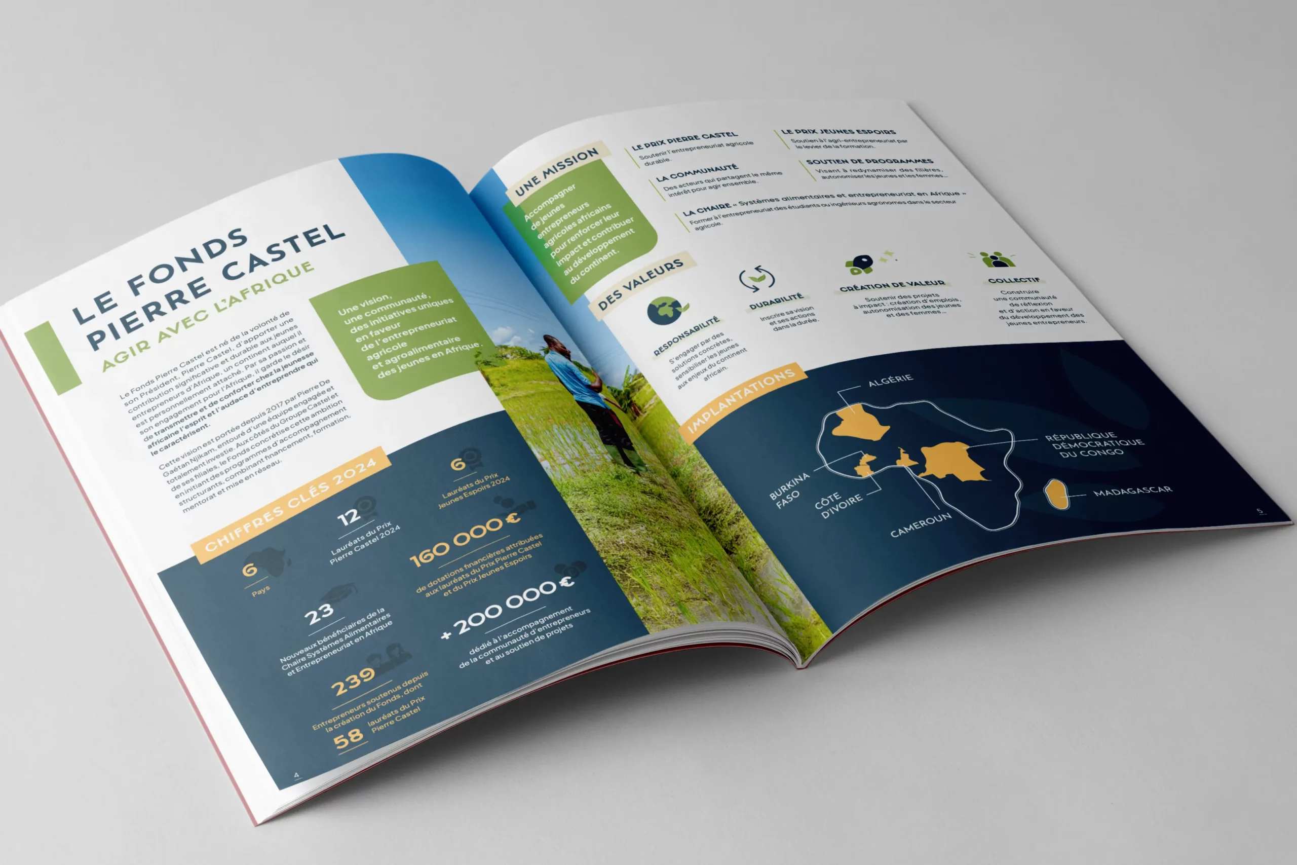 Depuis 2022, nous accompagnons le Fonds de dotation Pierre Castel dans la réalisation de ses rapports d’activité annuels. L’objectif : créer un document lisible, clair et cohérent avec l’identité de la fondation, valorisant ses actions et ses engagements. Un travail coordonné par Marie Dubois, Le monde selon Vous.