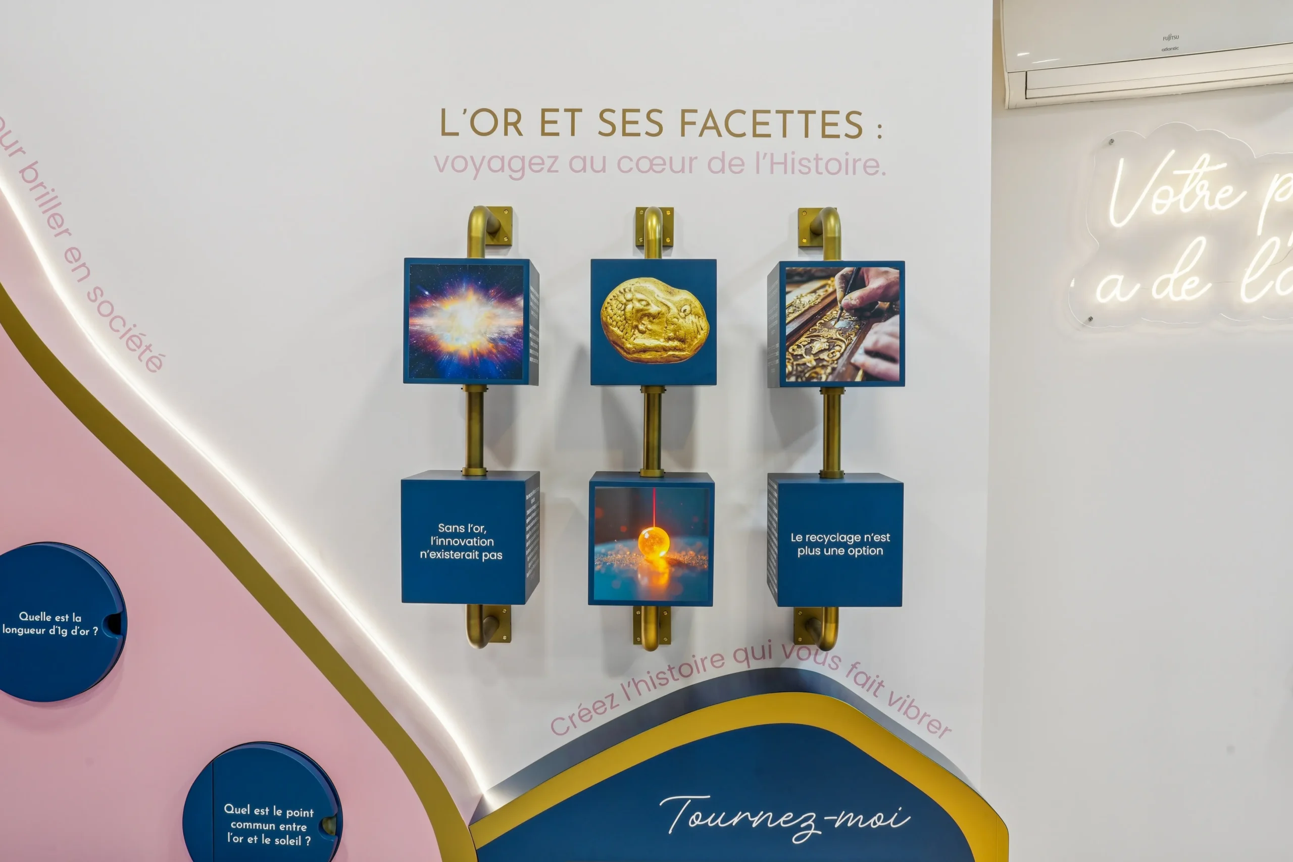 JUUD a aussi imaginé un nouveau concept pour nos boutiques. Je souhaitais des lieux expérientiels, pas seulement des comptoirs. Elles ont proposé un “mur-musée” pour apprendre, découvrir, comprendre l’univers de l’or à travers des écrans interactifs, des parcours ludiques, des contenus pédagogiques… L’objectif est de démocratiser le métier, de créer une rencontre avec nos clients. »