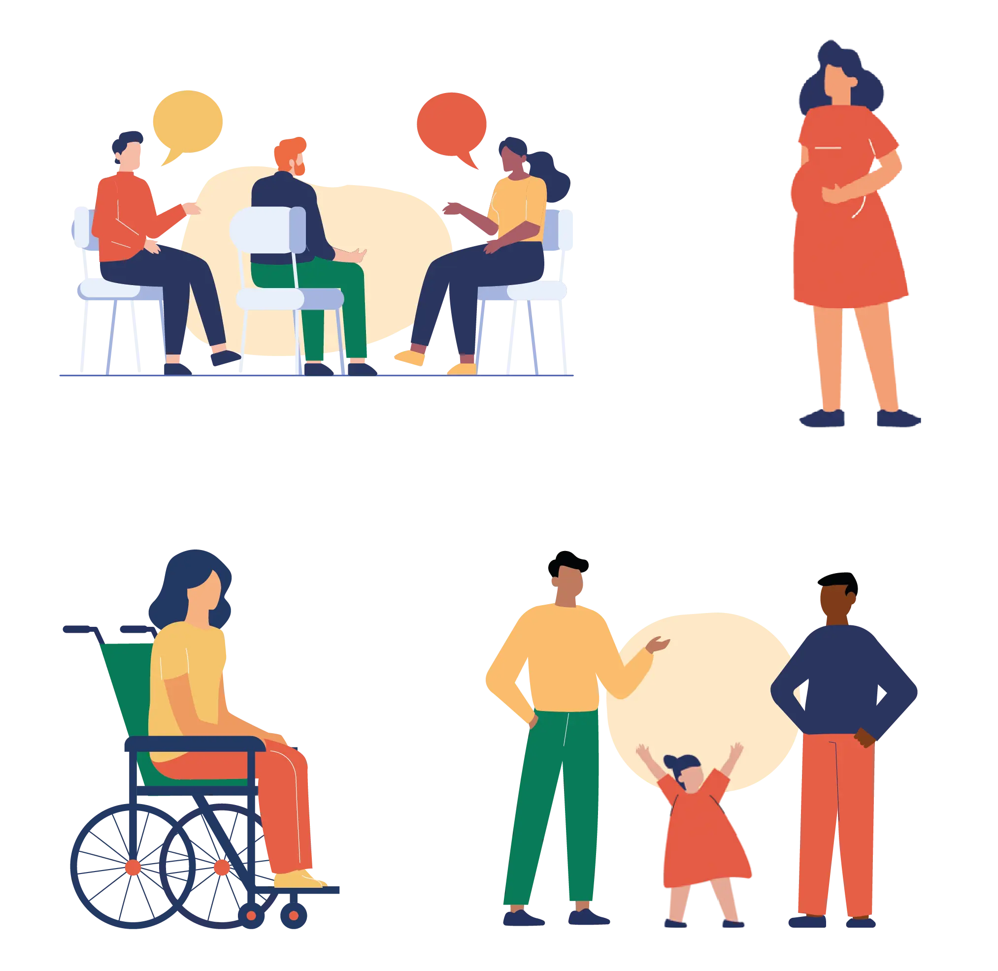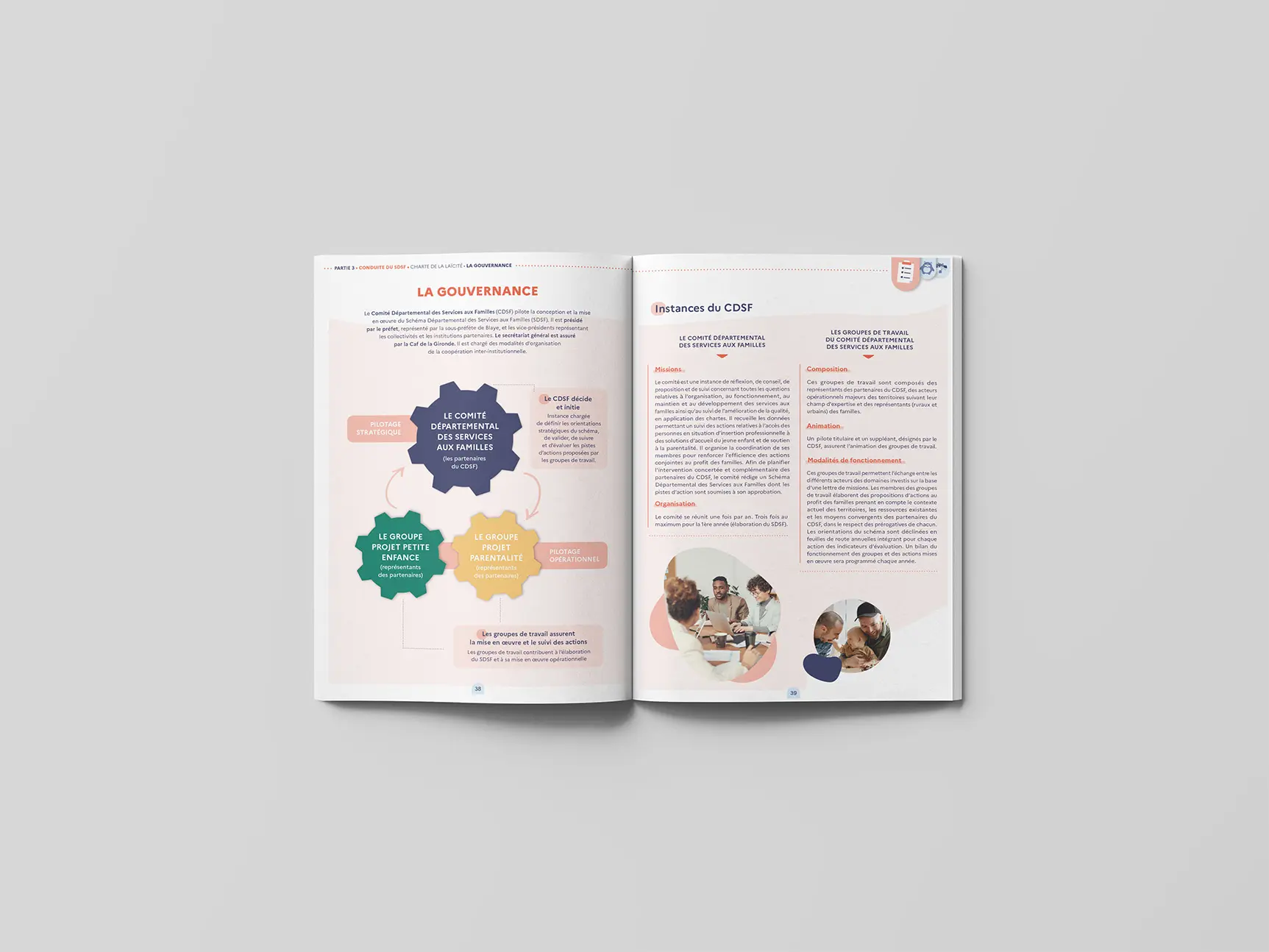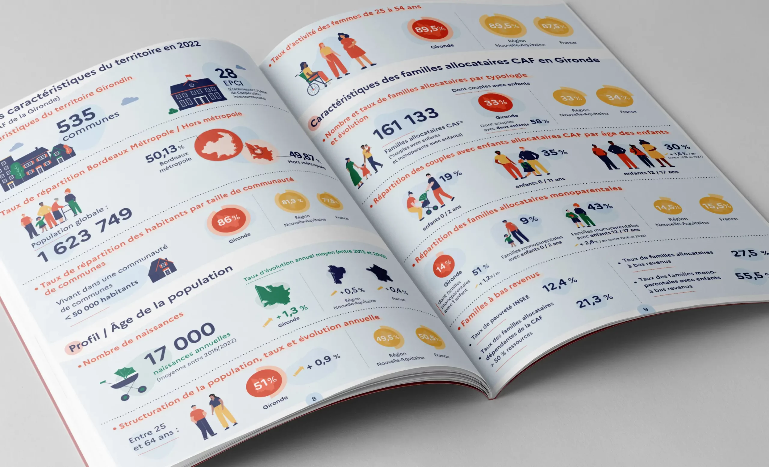 Nous avons imaginé une identité visuelle qui relie le fond et la forme. La carte de la Gironde, illustrée et habitée de scènes de vie, rend le document vivant et concret. Les couleurs institutionnelles assurent la cohérence avec les partenaires, tandis que les pictogrammes et formes organiques facilitent la lecture et renforcent le lien avec les thématiques de la petite enfance et de la parentalité.